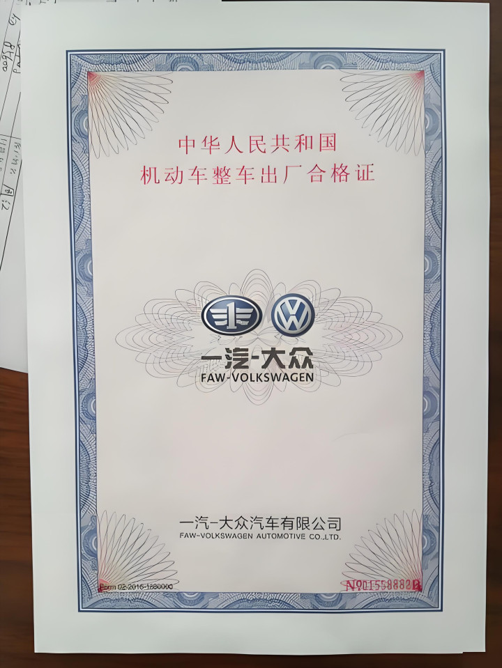 2、车辆合格证:即“机动车整车出厂合格证”,证明车辆符合出厂标准,无此证无法上牌。